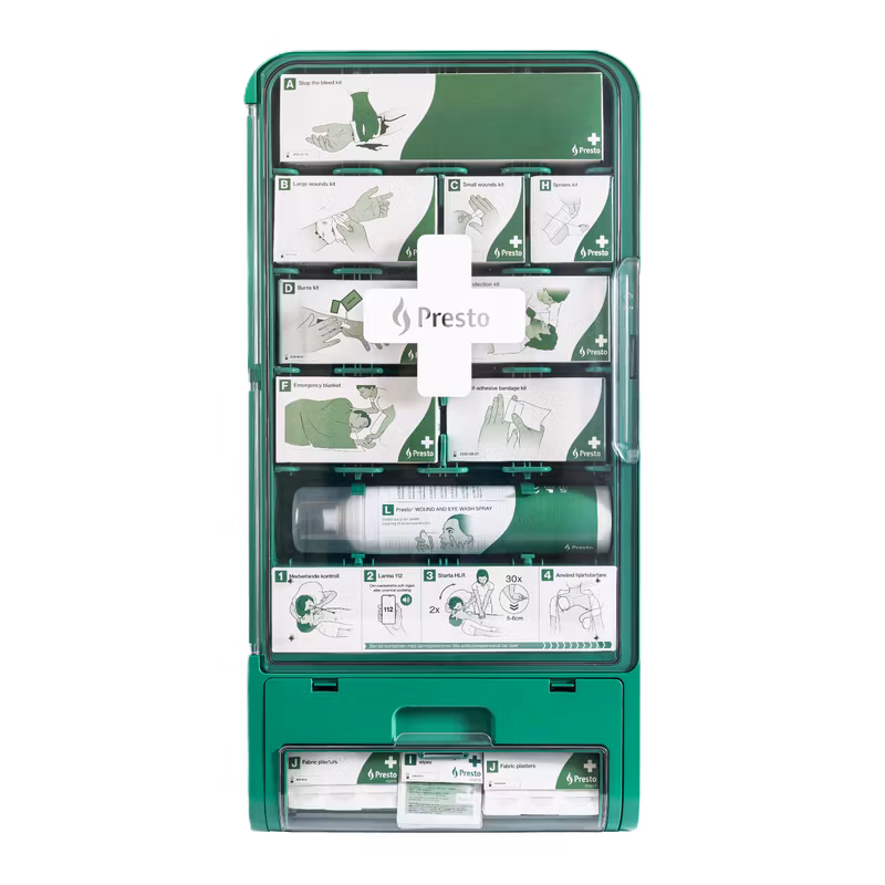 Flexibel första hjälpen-station med smart design! Till skillnad från många jämförbara lösningar på marknaden är Prestos station utrustad med kompletta kit noga anpassade för olika situationer. Istället för att innehålla enbart grundläggande plåster och förband får du en helhetslösning som är redo att hantera allt från småsår till större blödningar.