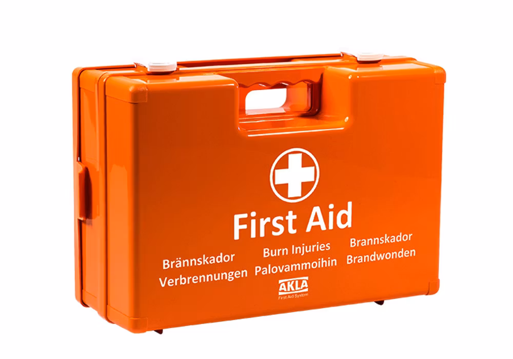 Stor välfylld brännskadelåda som innehåller flera olika storlekar av AKLAs FOR BURNS sortiment för att passa de vanligaste brännskadorna.